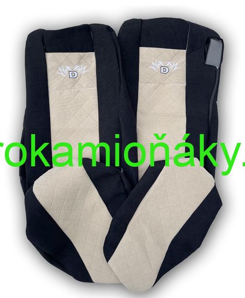 Potahy v pevnějším materiálu (manšestr), na truck DAF XF iXG od roku výroby 2021 s bezpečnostním pásem pouze u řidiče, opěrky hlavy jsou integrované v sedačce.