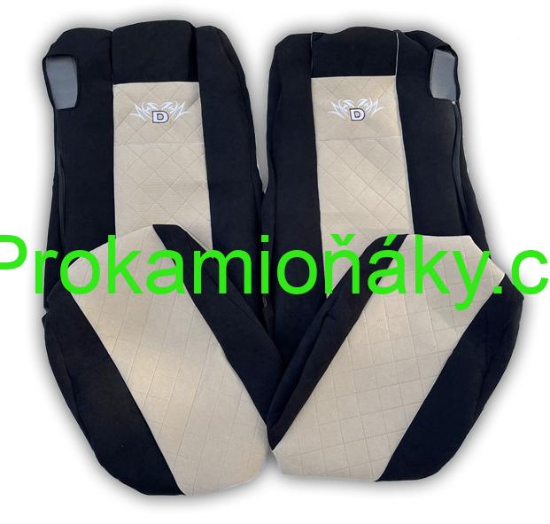 Potahy v pevnějším materiálu (manšestr), na truck DAF XF i XG od roku výroby 2021 s oběma bezpečnostními pásy na sedačkách, opěrky hlavy jsou integrované v sedačce.